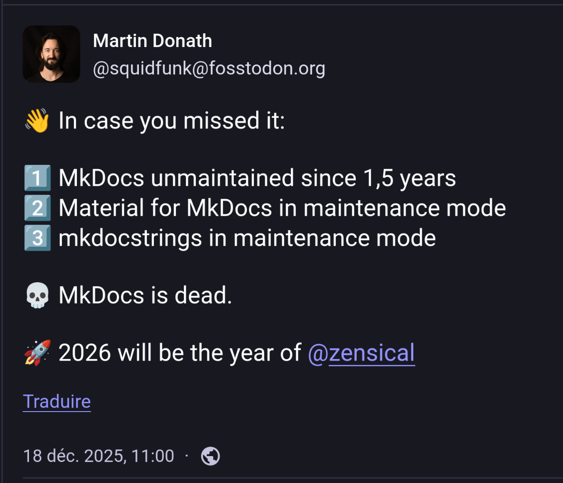 4 articles de blogs détaillent et expliquent les évolutions envisagées, puis l’arrêt de Material for MkDocs et enfin la création d’un nouveau framework Zensical :