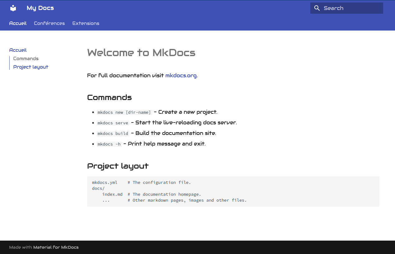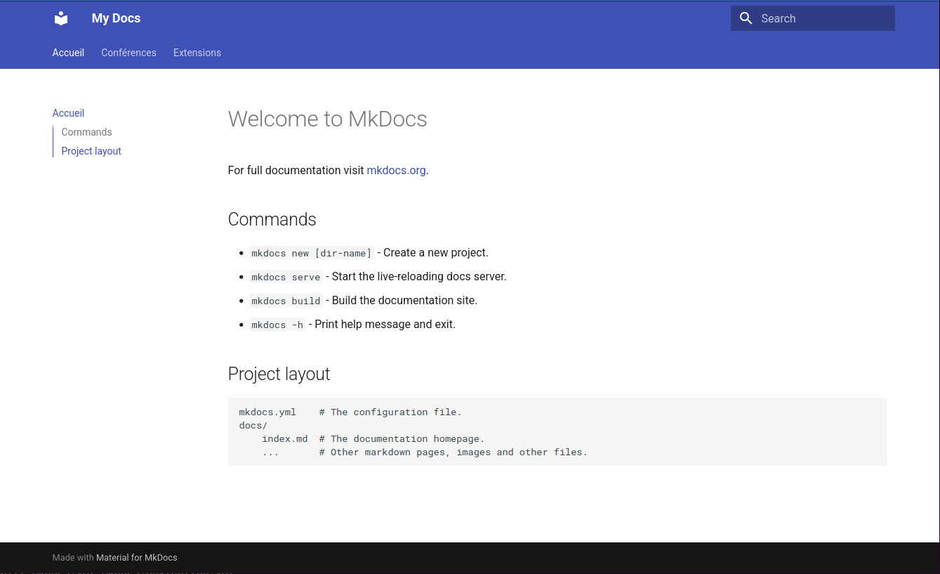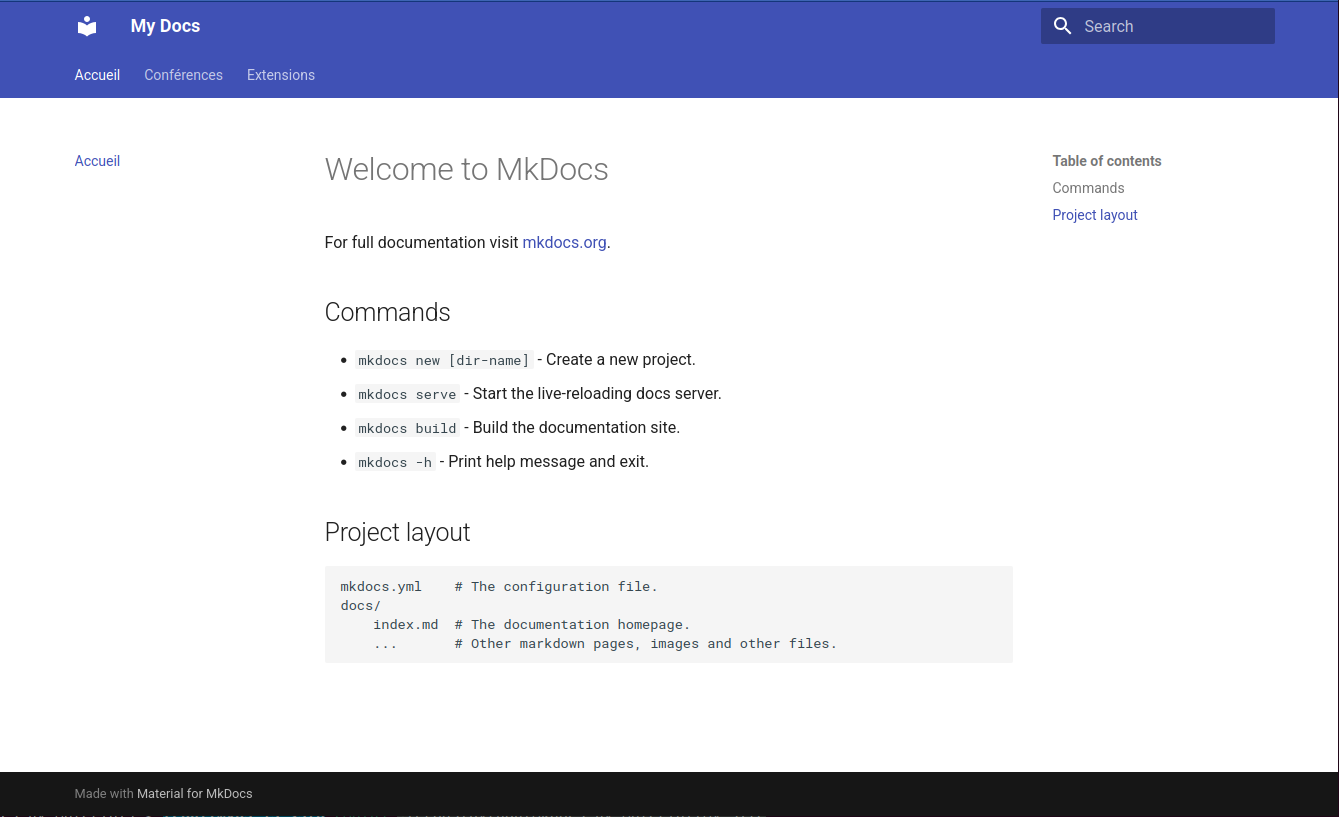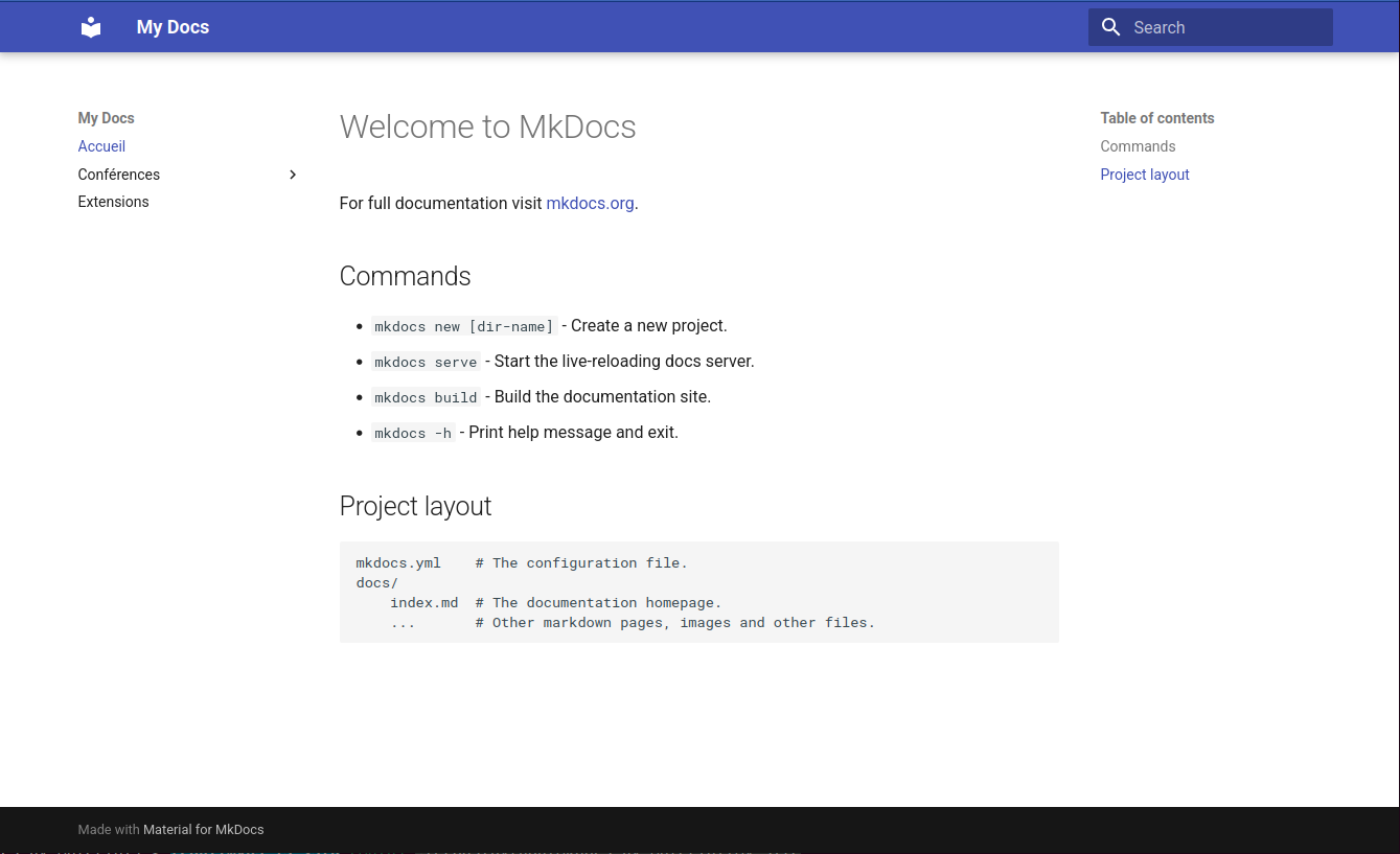 pip install mkdocsmkdocs new my-sitecd my-sitemkdocs serveFonctions intégrées