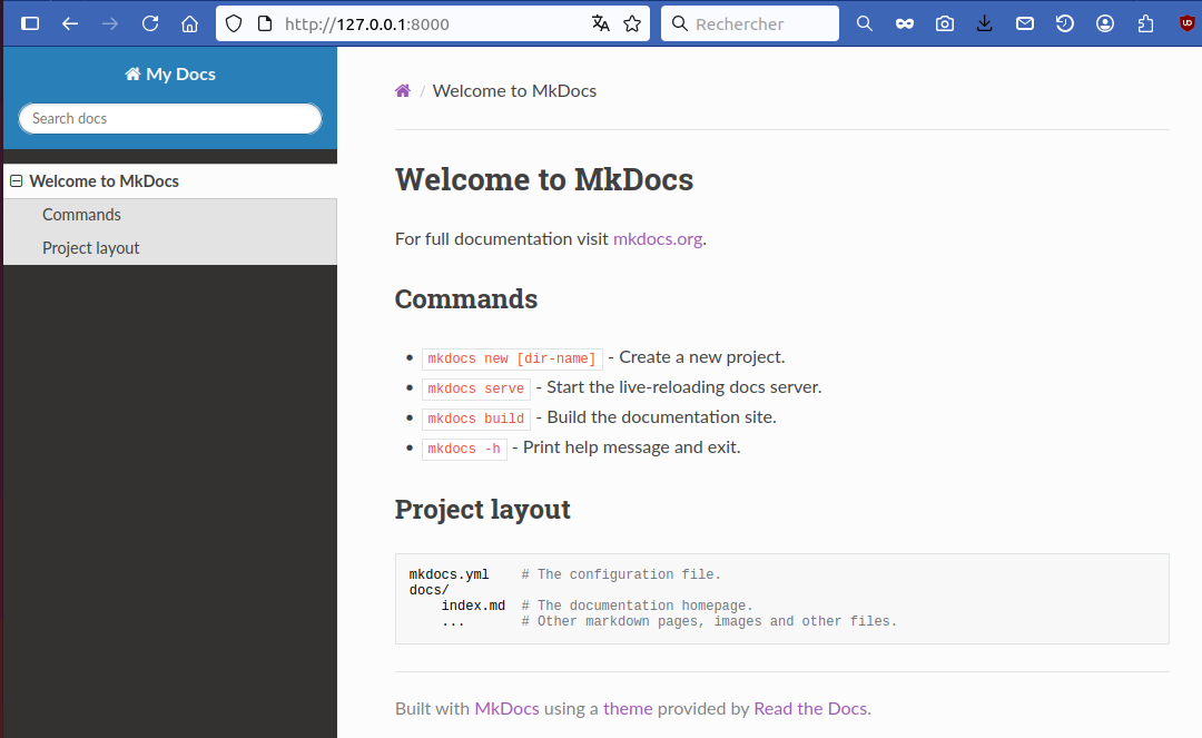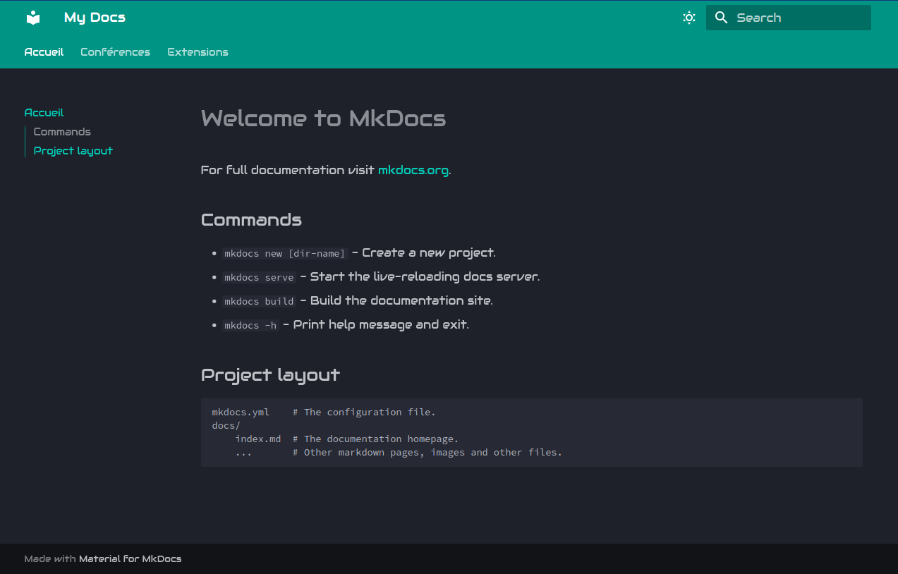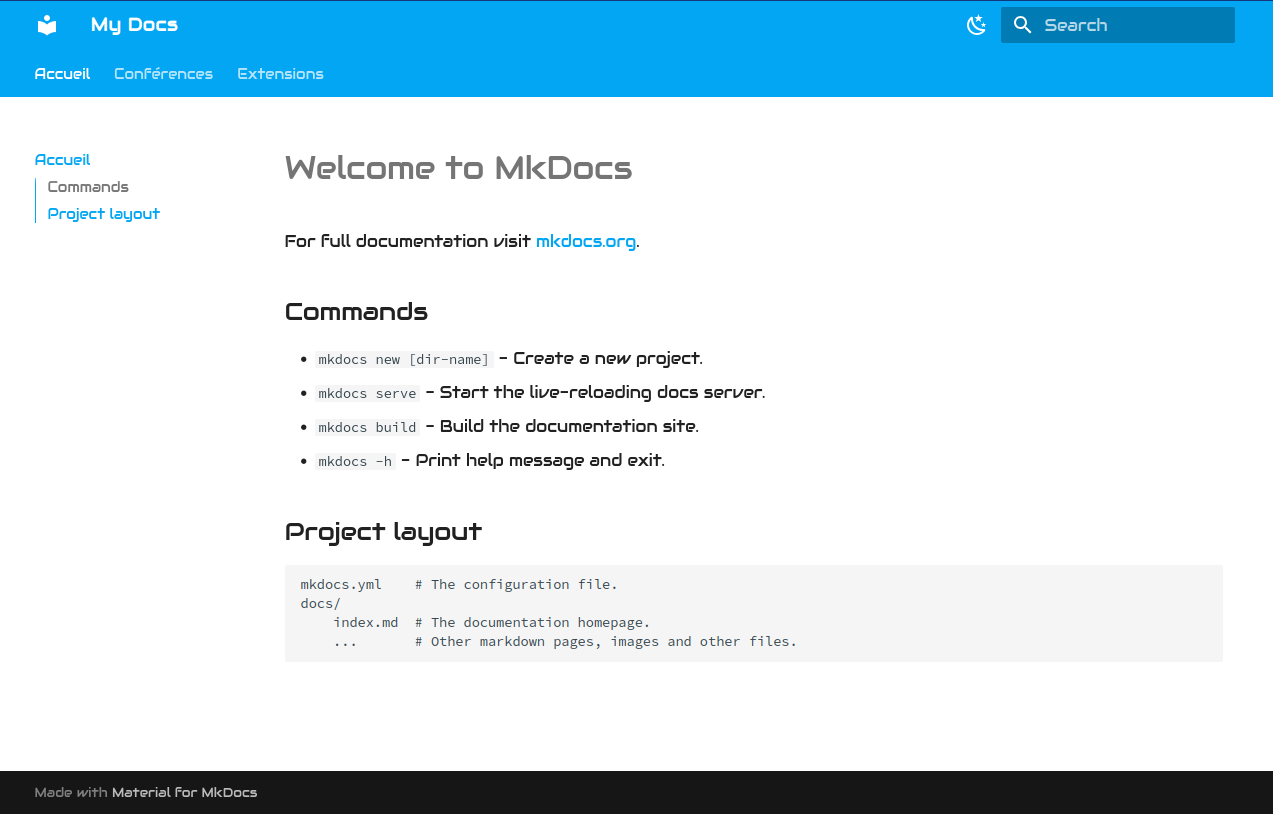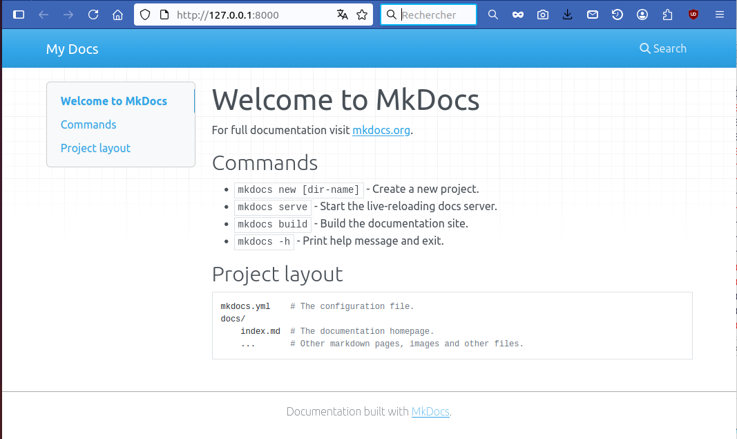 pip install mkdocsmkdocs new my-sitecd my-sitemkdocs serveFonctions intégrées