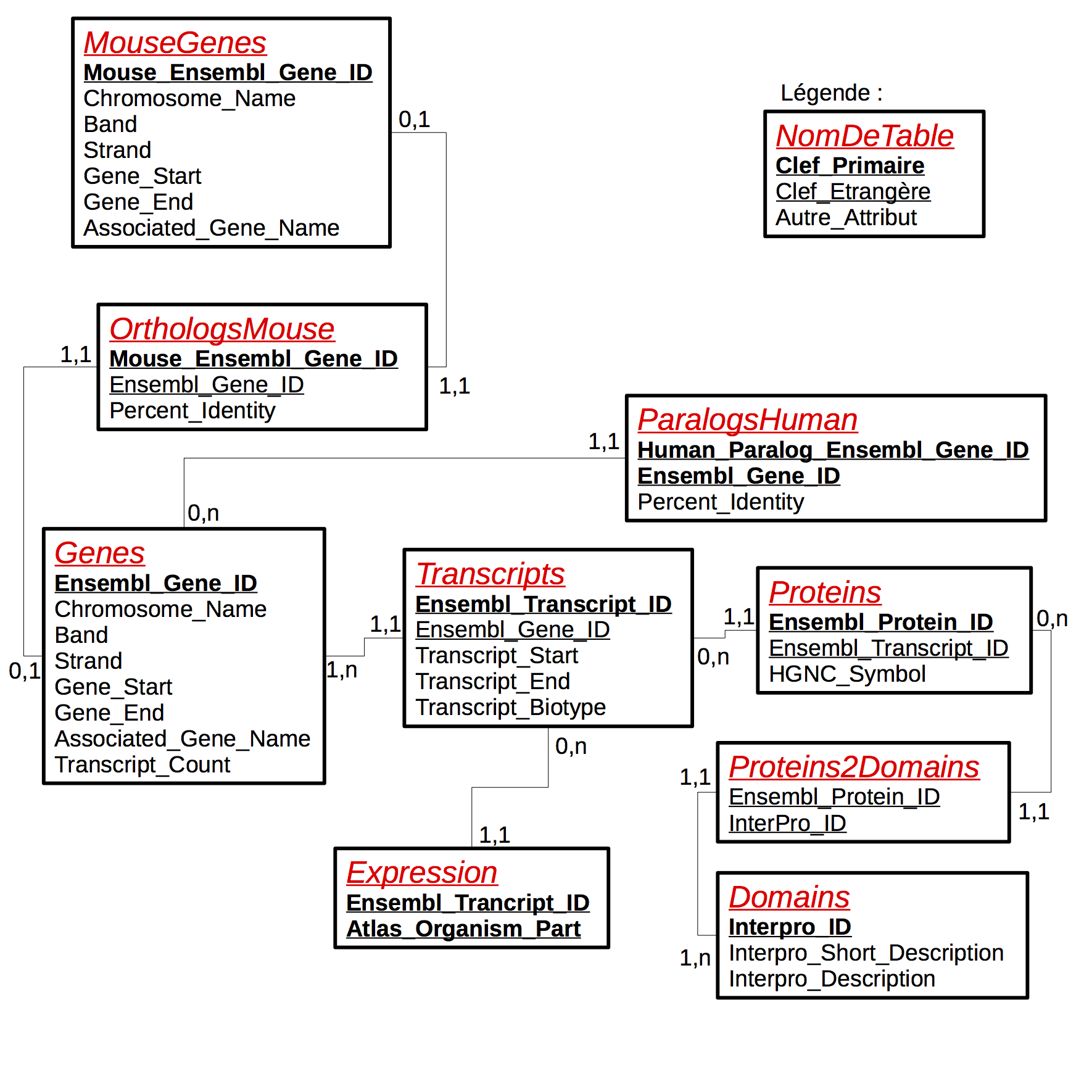 Elle doit contenir toutes les informations données par la table Genes, ainsi que la liste de ses transcrits (accompagnés de leurs positions de départ et de fin).